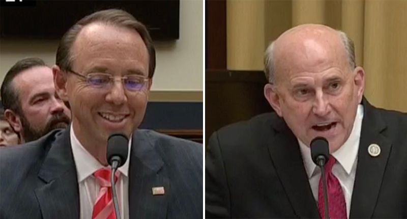 A smirking Deputy Attorney General Rod Rosenstein took Rep. Louie Gohmert (R) to school on Wednesday afternoon after the combative Texan went on a rant about FISA warrants, badgering Rosenstein without letting him answer.
