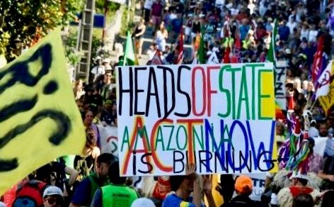 "Heads of state: act now, Amazonia is burning!" read one banner as the huge crowd rallied under cloudless blue skies in the French coastal town of Hendaye, the slogan referring to the wildfires ravaging the world's largest rainforest.