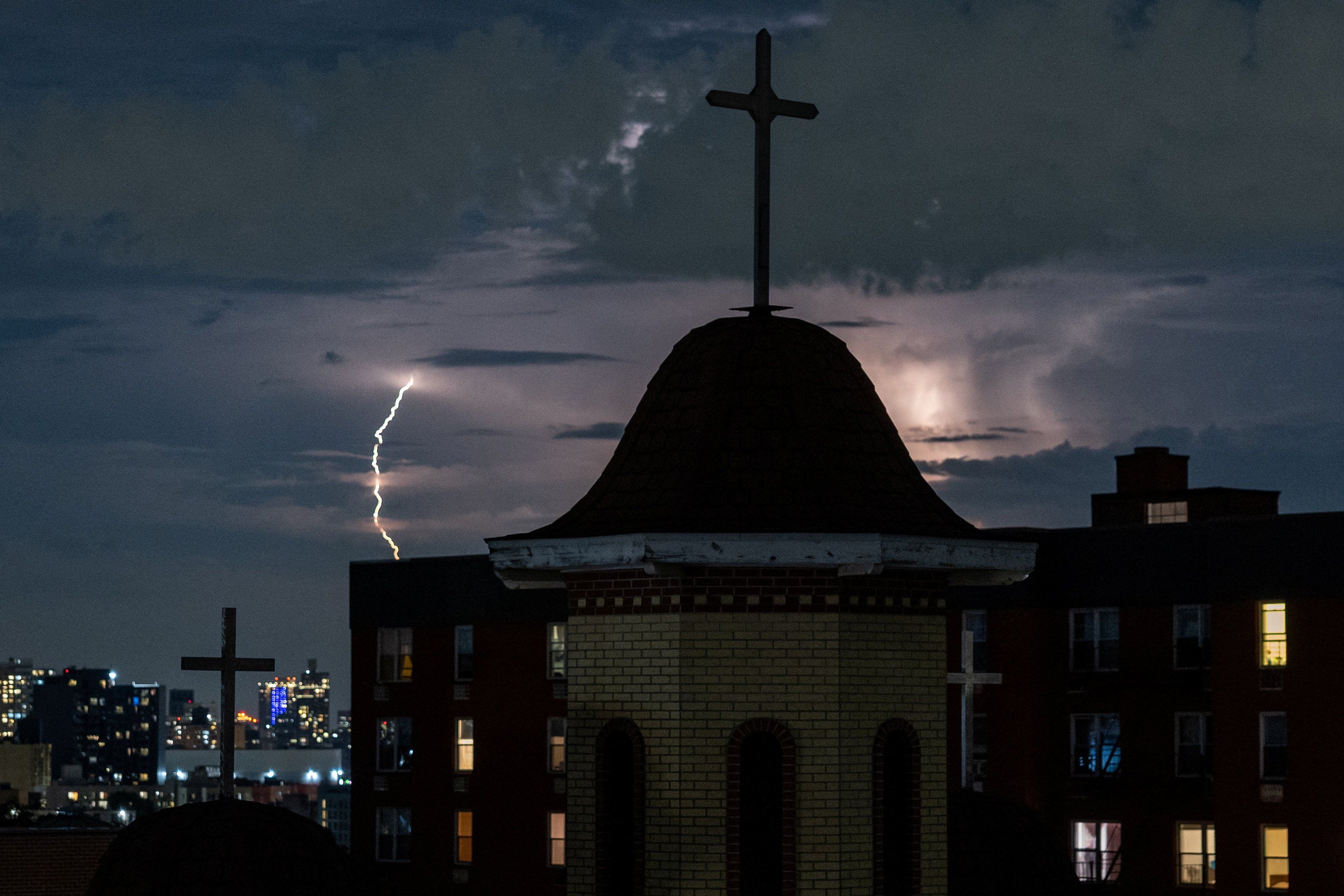 Lightning illuminates the sky behind a church in Queens, New York City, U.S., June 25, 2025. REUTERS/Kylie Cooper