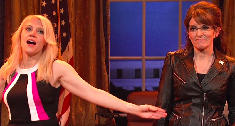 Wrapping up Saturday Night Live's season, host Tina Fey -- the show's former head writer -- reprised her famous Sarah Palin impersonation in a star-studded finale that had her sharing the stage with cast regular Kate McKinnon as Kellyanne Conway and actor John Goodman as Rex Tillerson.