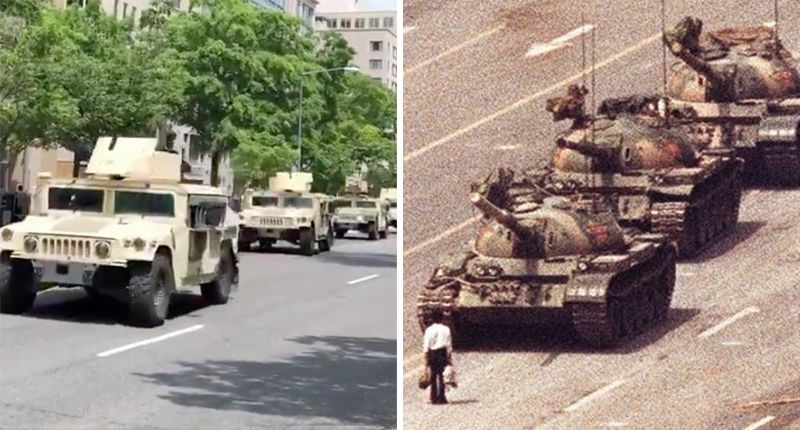 Composite image of military convey in DC and one in Beijing (screengrabs)