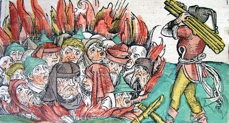 The Christian world responded by turning on its usual scapegoat: Jews, ‘the sons of the crucifiers’. Reports spread that Jews were emptying little leather pouches of poison into the wells of Europe’s cities. Jews were rounded up in village and city squares–from Christian Spain through France and Germany to Holland—and burned in their thousands. It would be easy to blame the ignorant mob, but it was usually the secular and religious authorities—the city councils run by merchants and craftsmen, the great lords and dukes who ruled cities and territories, and the Holy Roman Emperor himself—who arrested Jews, initiated the tortures, presided over the confessions and ‘trials’ and organised the massacres.In Basel, Switzerland, 600 Jewish men and women were herded into a wooden barn and burned to death with the support of the prince-bishop; perhaps the worst massacre occurred in Strasbourg, France, where the bishop, his senior clergymen and the city guild authorised the rounding up of some 2,000 Jews and burned them to death.
