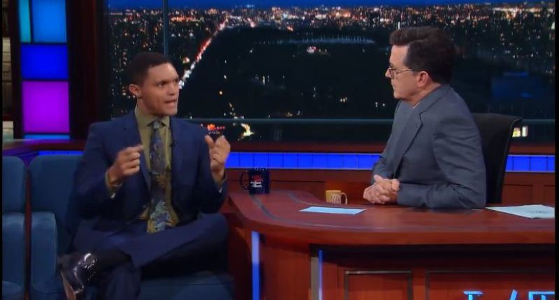 "The Daily Show"'s Trevor Noah (left) and "The Late Show"'s Stephen Colbert (right) via screengrab.