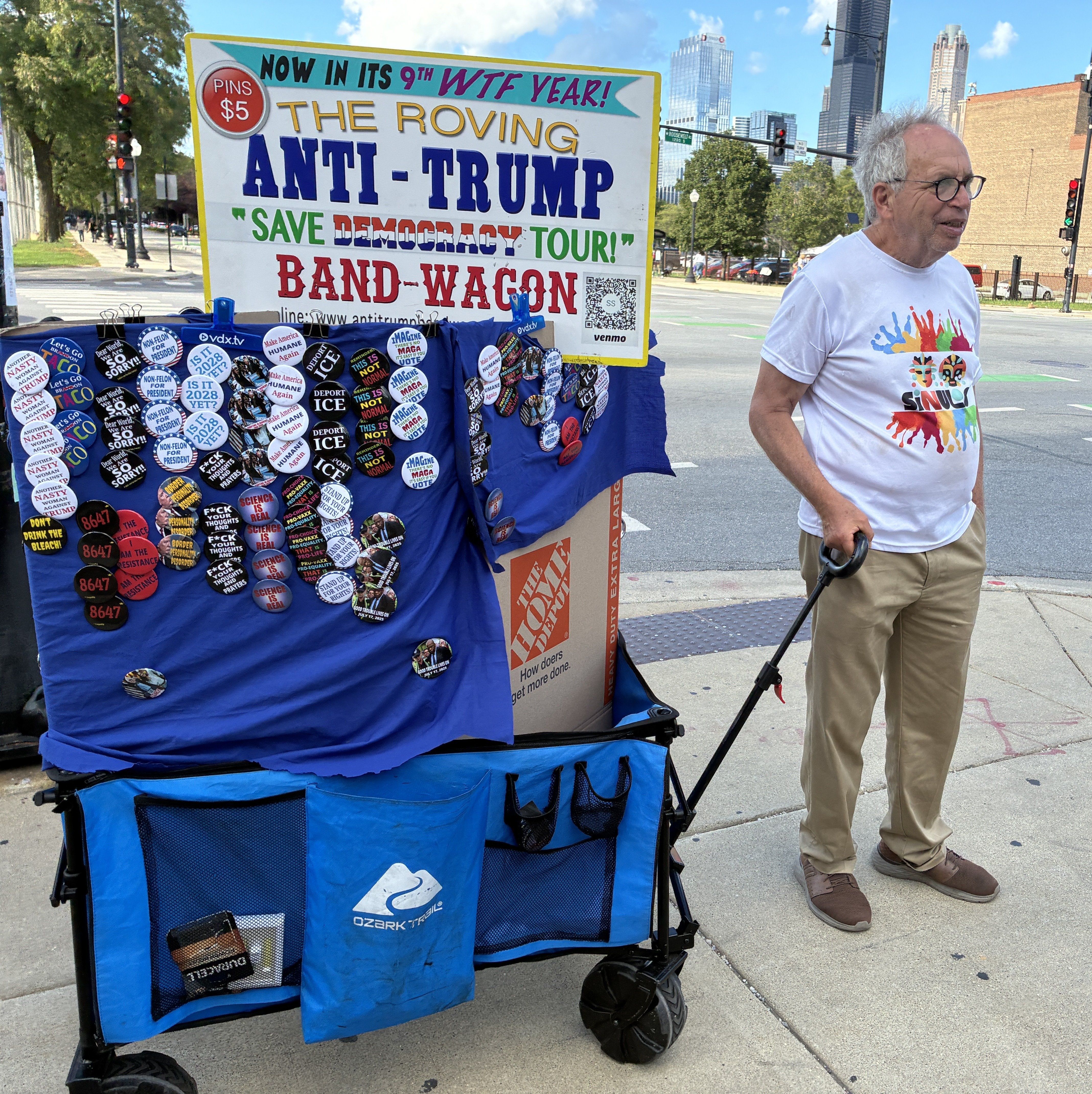 Stan Sinberg traveled from San Francisco with a blue wagon he dubbed the “The Roving Anti-Trump ‘Save Democracy Tour!’ Band-Wagon.”