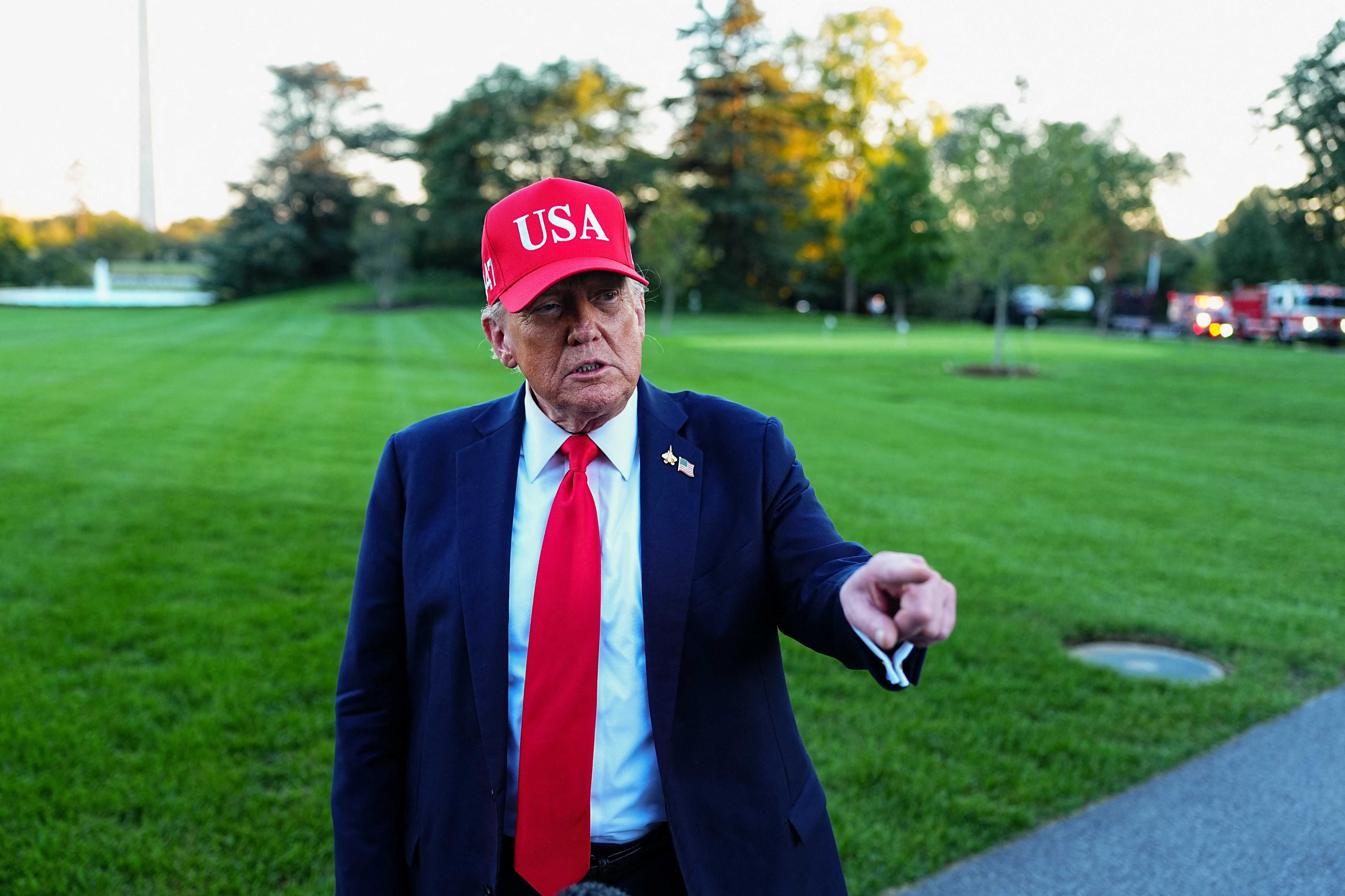 U.S. President Donald Trump speaks to members of the media as he arrives at the White House in Washington, D.C., U.S., October 5, 2025. REUTERS/Aaron Schwartz