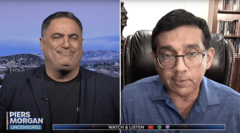 Liberal analyst Cenk Uygur scoffed at MAGA pundit Dinesh D'Souza during a recent episode of "Piers Morgan Uncensored" over the peace deal President Donald Trump announced to end the war between Israel and Hamas.