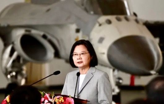 Taiwan's President Tsai Ing-wen in front of a domestically-produced F-CK-1 fighter jet during a visit to Penghu Air Force Base on September 22, 2020