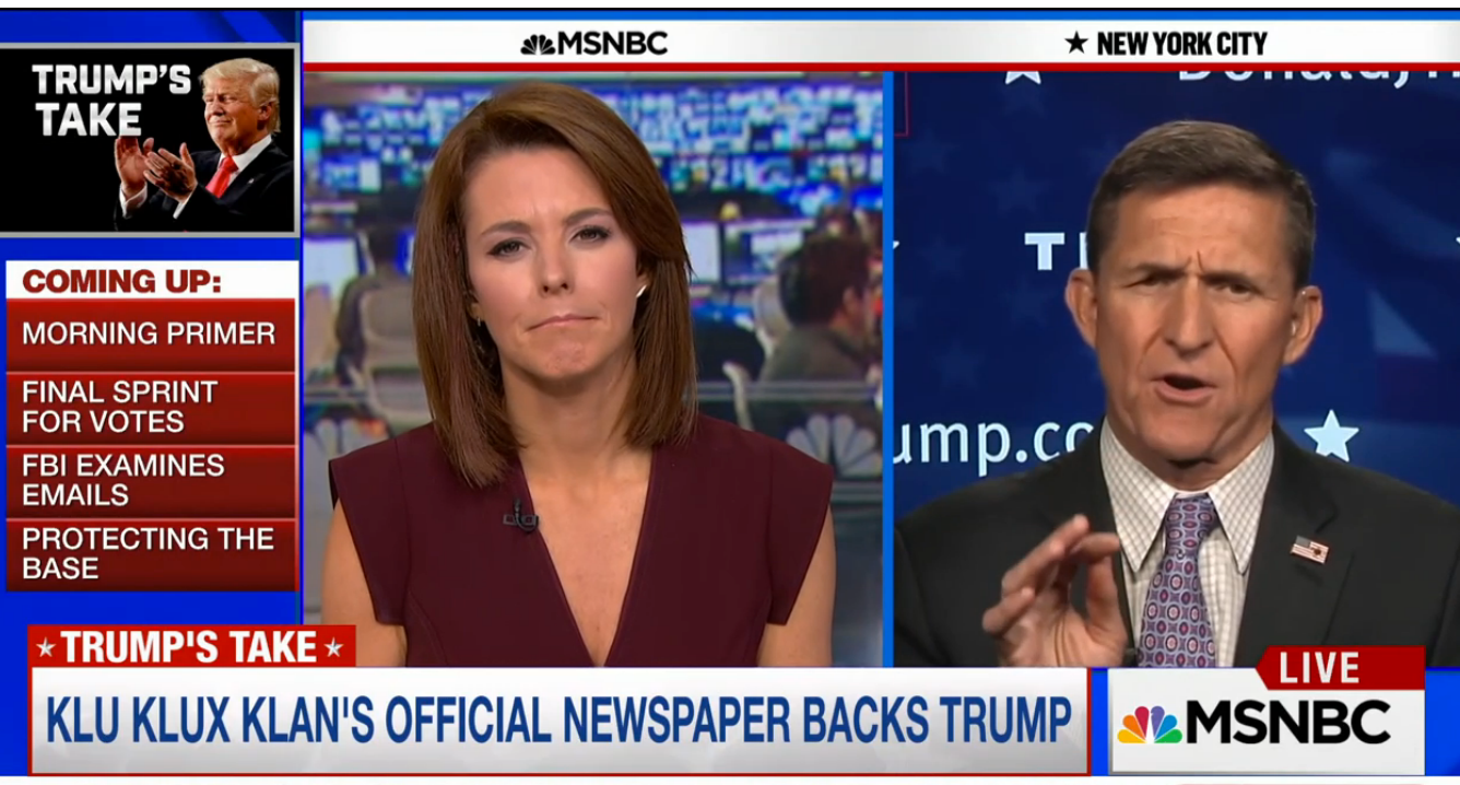Later in the interview, Ruhle asked Flynn to address the nationalistic undertones helping elevate Trump’s candidacy. Before she could even ask her question, Flynn launched into an attack on the host, accusing her of demeaning her credibility as a journalist by “even raising that issue.”