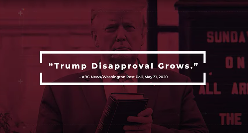 "He wasn't there to offer words of calm and comfort," the ad said. "Instead, he became what we all feared. Evoked the worst of our past. Threatened our governors and states. He ordered our own soldiers who fought in Iraq and Afghanistan to flood the streets, instructing them to turn against Americans. Used churches and the Holy Bible as political props. He didn't invoke the Lord to give us wisdom, but to boost his polls."