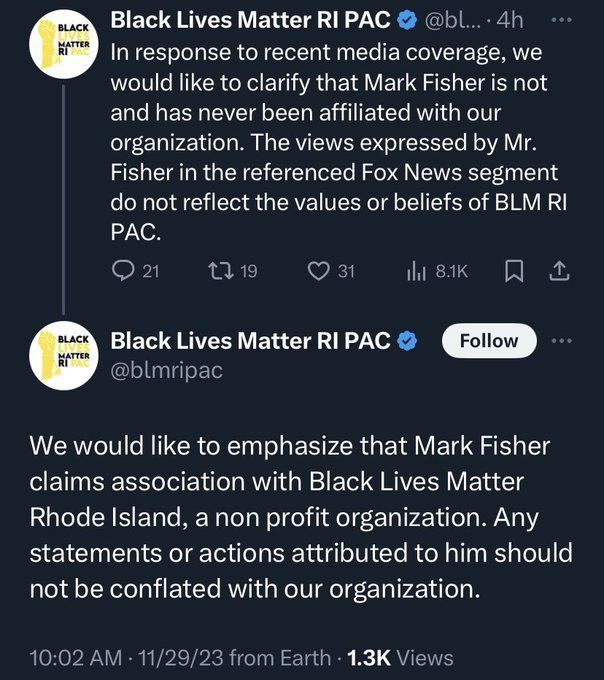 In a second tweet, the group wrote, "We would like to emphasize that Mark Fisher claims association with Black Lives Matter Rhode Island, a non profit organization. Any statements or actions attributed to him should not be conflated with our organization."