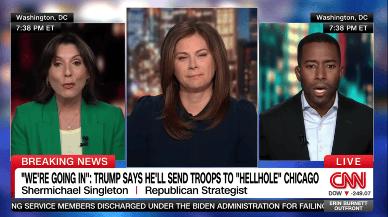 Lulu Garcia-Navarro and Shermichael Singleton joined Erin Burnett on her show, "OutFront," to react to Illinois Gov. J.B. Pritzker's fiery response to Trump's threat to send troops to Chicago, which Trump called a "hellhole."