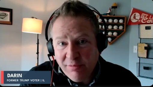 Darin, a former Trump voter from Illinois, spoke out in a video provided by Republican Voters against Trump. The group recently announced an ad campaign to highlight the voices of former Trump voters.