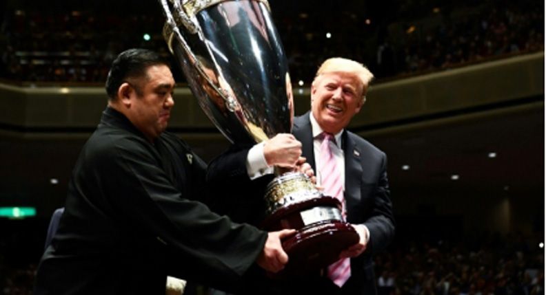 Trump read in English from a scroll, offering Asanoyama the cup "in honour of your outstanding achievement", before lifting the massive trophy with the help of a sumo official and presenting it to the wrestler with an enormous grin.