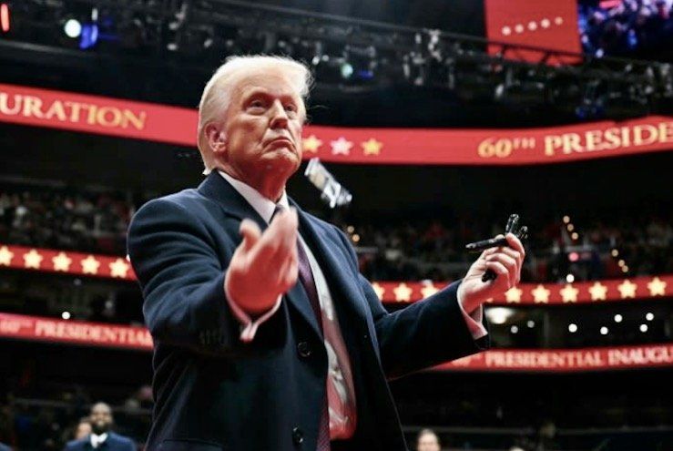 U.S. President Donald Trump throws pens to the crowd after signing executive orders during his inaugural parade (Jim WATSON/AFP)