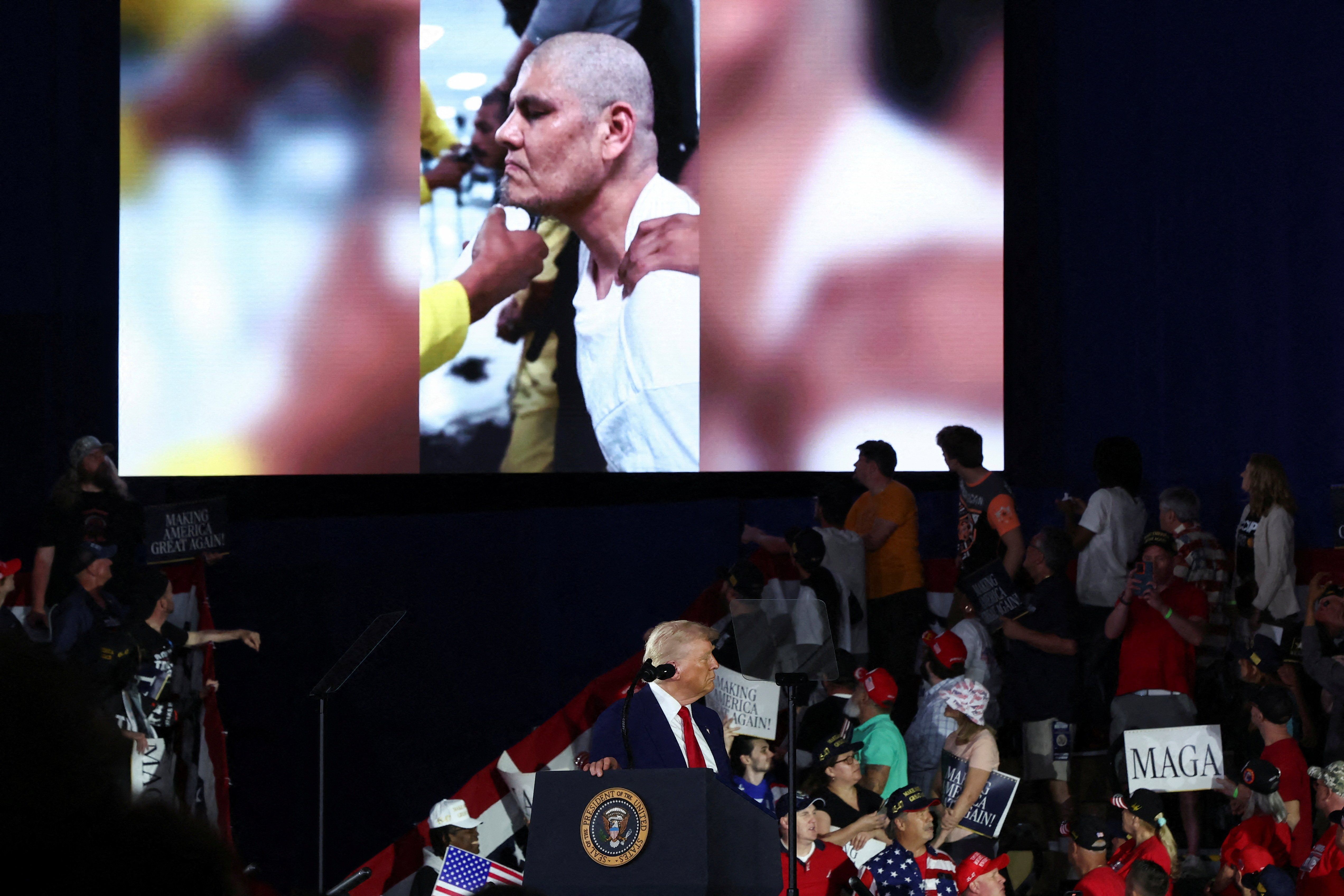 Trump has often entertained the thought of violence against people who interrupt him, famously telling crowds in 2016 to attack protesters and that he would pay their legal fees. He went on to pardon around 1,500 people who stormed the Capitol to try to prevent the certification of his election loss in 2020.