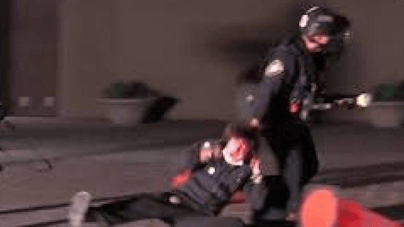 Video shows a Homeland Security agent grab a protester and drag them away, and then another federal officer fires a non-lethal weapon point blank at 21-year-old Kaden Rummler as he steps forward from the group holding a megaphone, reported the Los Angeles Times.