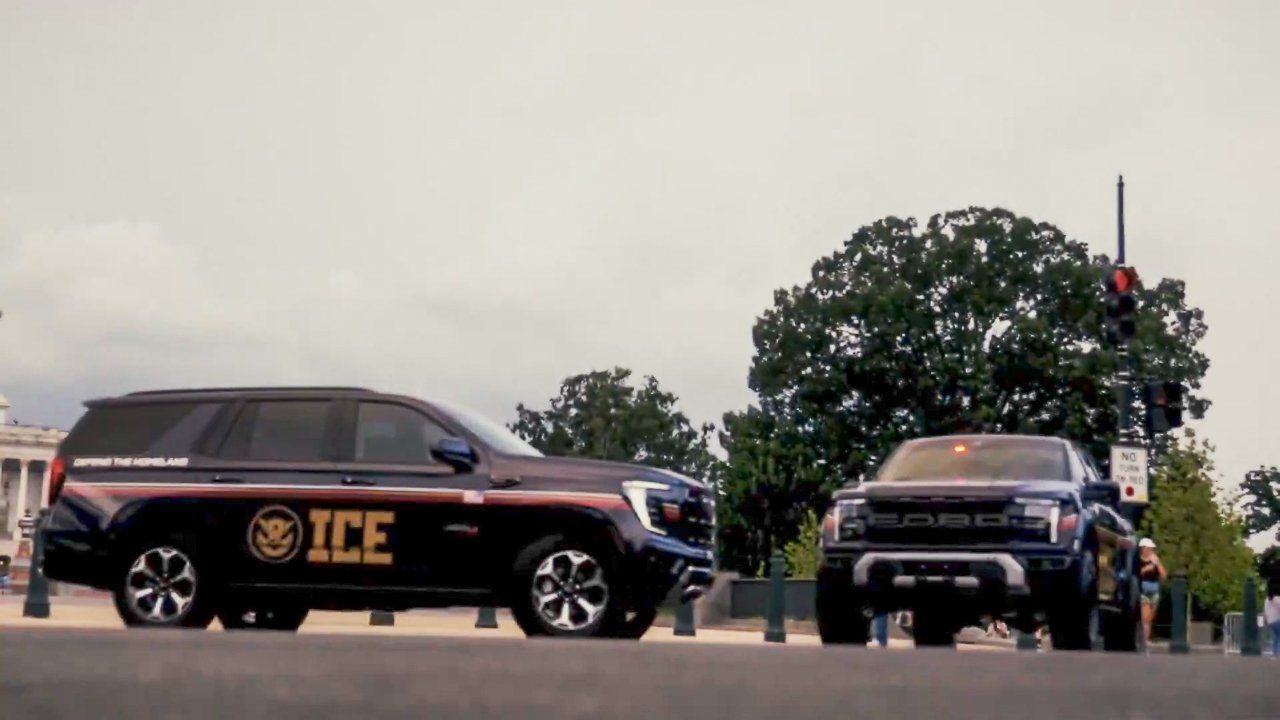 As music plays in the background, several Immigration and Customs Enforcement vehicles drive through city streets. The vehicles' color schemes resemble Trump's private jet. In one shot, the president's name is visible in gold on a vehicle.