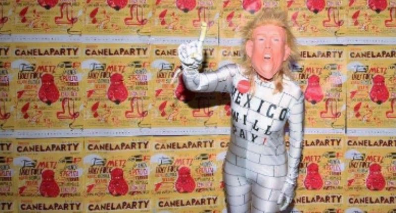 A person in a Trump mask wears a "Build The Wall" costume. Image via Amazon.