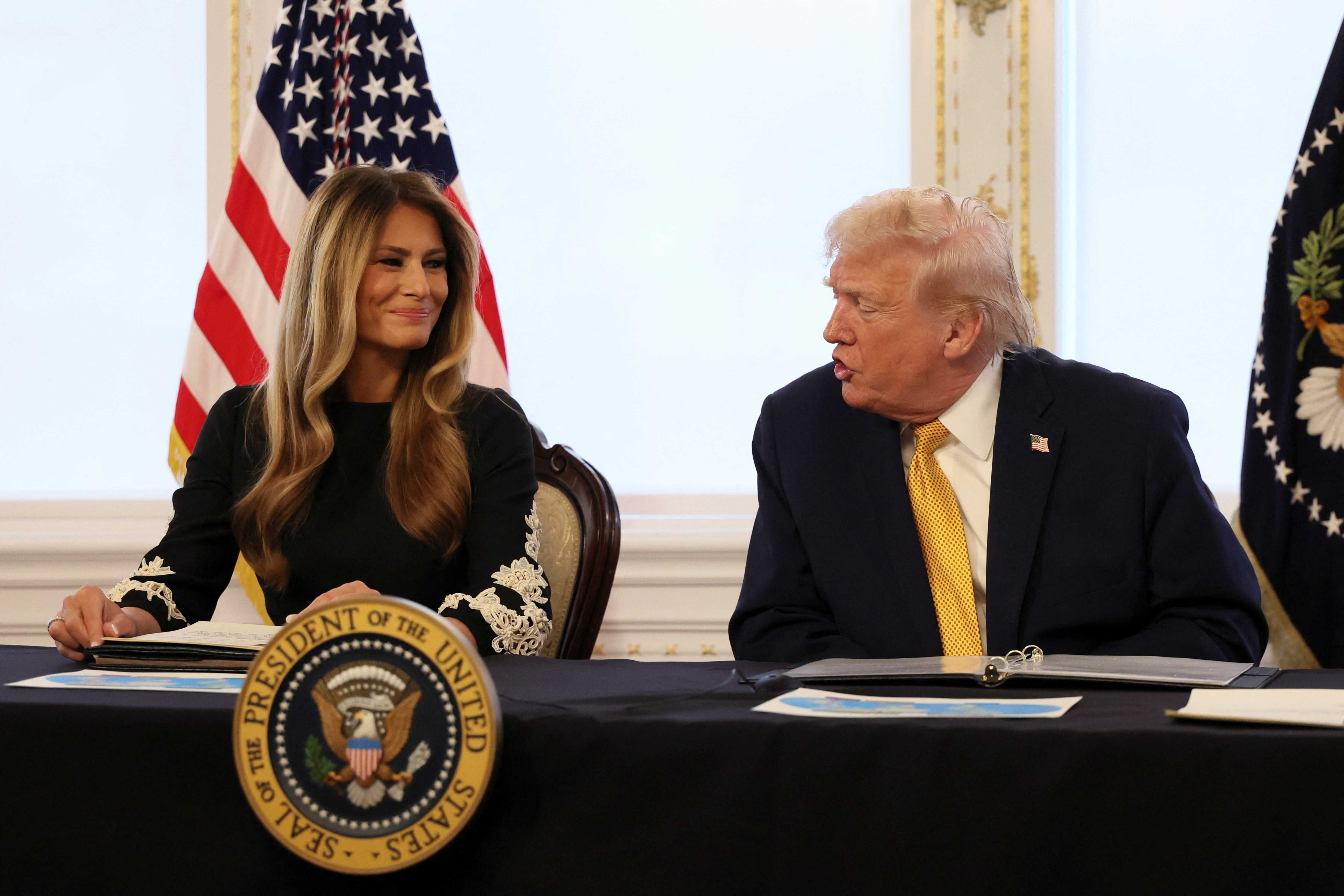 U.S. President Donald Trump and first lady Melania Trump participate in calls to U.S. service members, on Christmas Eve, from the Mar-a-Lago club in Palm Beach, Florida, U.S., December 24, 2025. REUTERS/Jessica Koscielniak