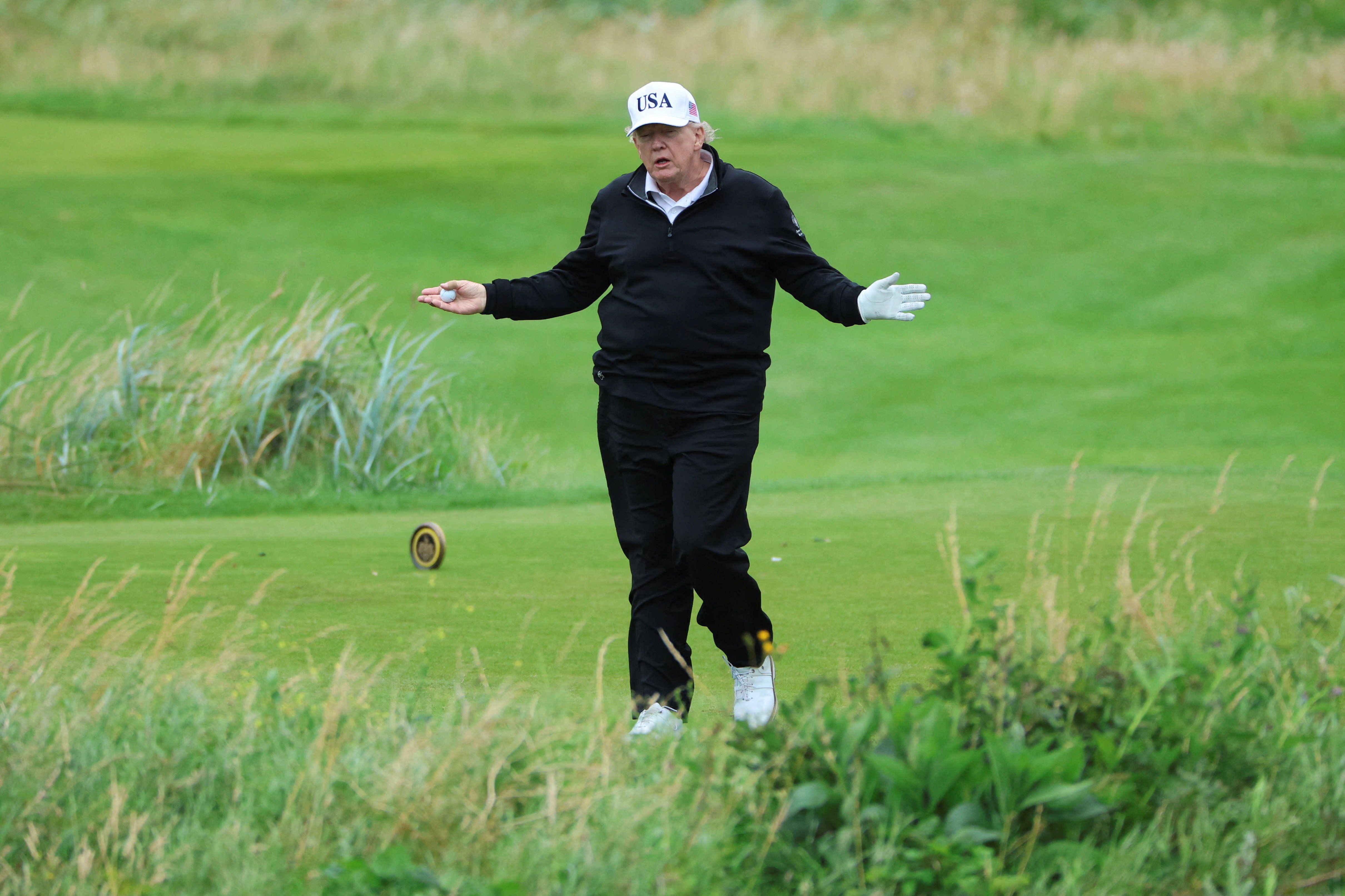 U.S. President Donald Trump gestures as he golfs at Trump Turnberry resort in Turnberry, Scotland, Britain, July 27, 2025. REUTERS/Phil Noble