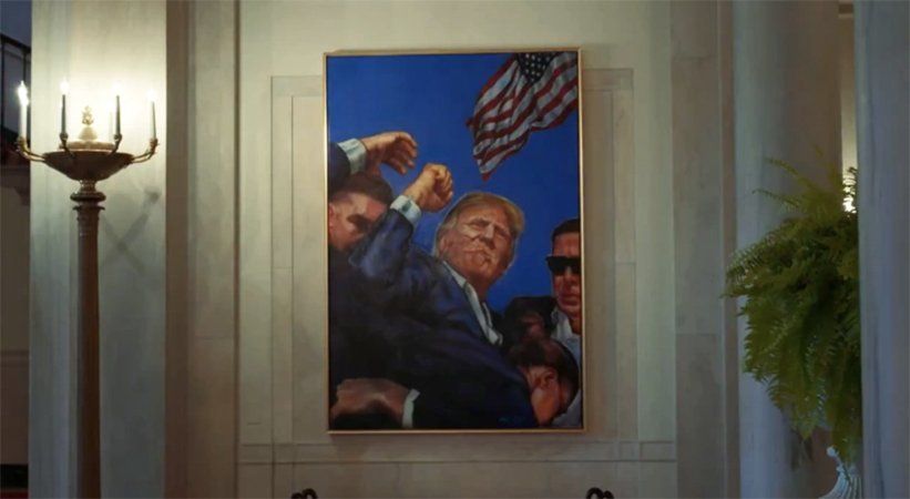 The new painting shows the iconic moment when a bloodied Trump pumped his fist and shouted "fight" after a gunman shot him in the ear in Butler, Pennsylvania in July 2024.