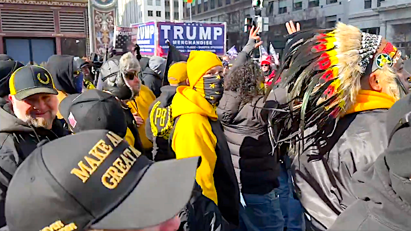 The militants wore black-and-gold Proud Boys clothing and hats and carried pro-Trump signs, and they also chanted "51st state," an apparent reference to the newly inaugurated president's suggestion that Canada should be merged with the U.S.