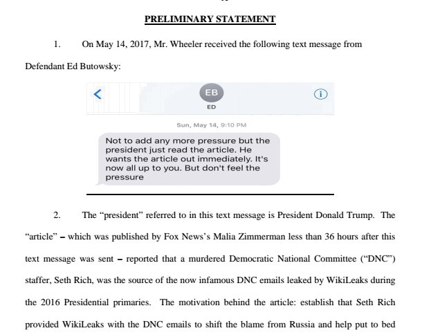 The lawsuit, filed Tuesday by Fox News contributor Rod Wheeler, alleged a wealthy Republican donor and the conservative network coordinated with the White House to promote bogus claims about a slain DNC staffer to deflect from the Russia scandal.