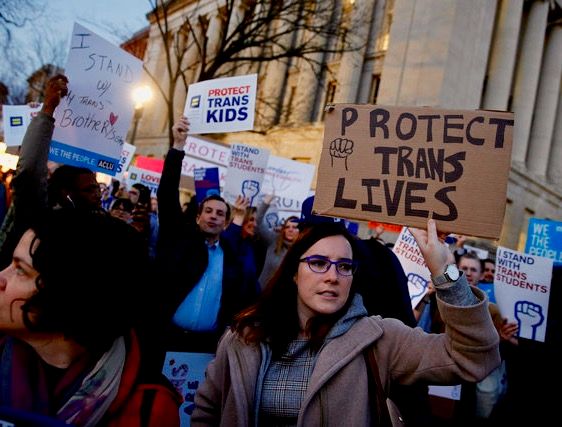 A couple hundred people gathered in front of the White House to protest the Trump action, waving rainbow flags and chanting: "No hate, no fear, trans students are welcome here." The rainbow flag is the symbol of lesbian, gay, bisexual and transgender people.
