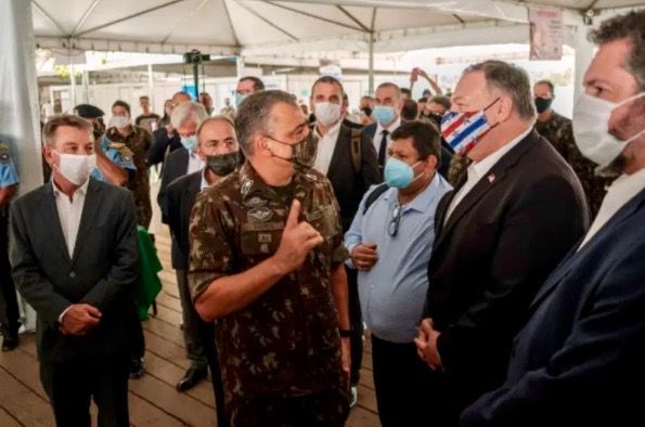 Secretary of State Mike Pompeo, wearing a mask, tours a processing center for Venezuelan migrants on a September 2020 visit to the Brazilian border town of Boa Vista