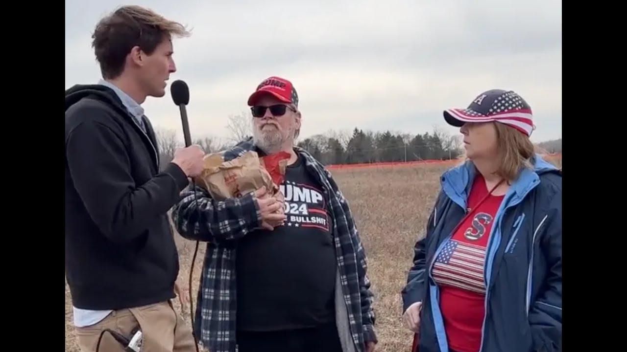 The man, festooned in Trump regalia, reflexively responds, "Uh, they just want to disrupt in any way possible."