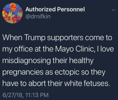 WUSA 9 reports that the hoax began with a tweet from a woman claiming to be a Mayo Clinic doctor who thrilled in forcing Trump supporters to abort their children by "misdiagnosing their healthy pregnancies as ectopic."