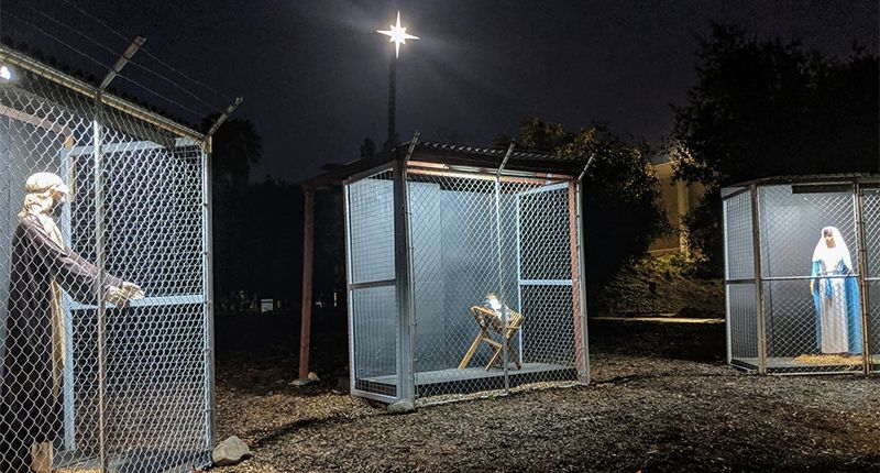 The scene depicts Mary, Joseph, and the baby Jesus separated and put in their own cages, a reference to the families separated at the U.S.-Mexico border. Inside the church, the family is shown as reunited.