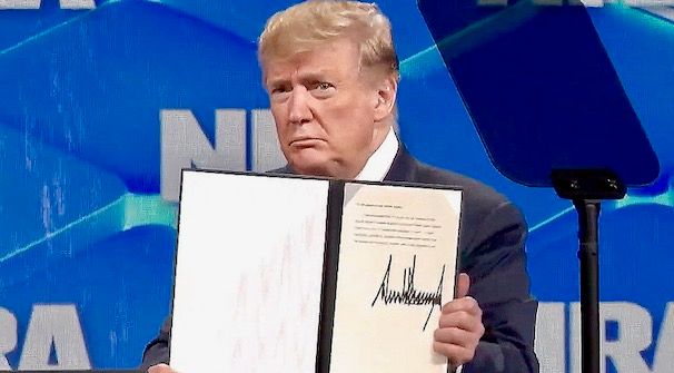 A theatrical President Donald Trump thrilled attendees at Friday's annual NRAconvention by delivering a surprise announcement. Trump pulled out a pen and signed an order effectively removing the United States from a global gun trade treaty.