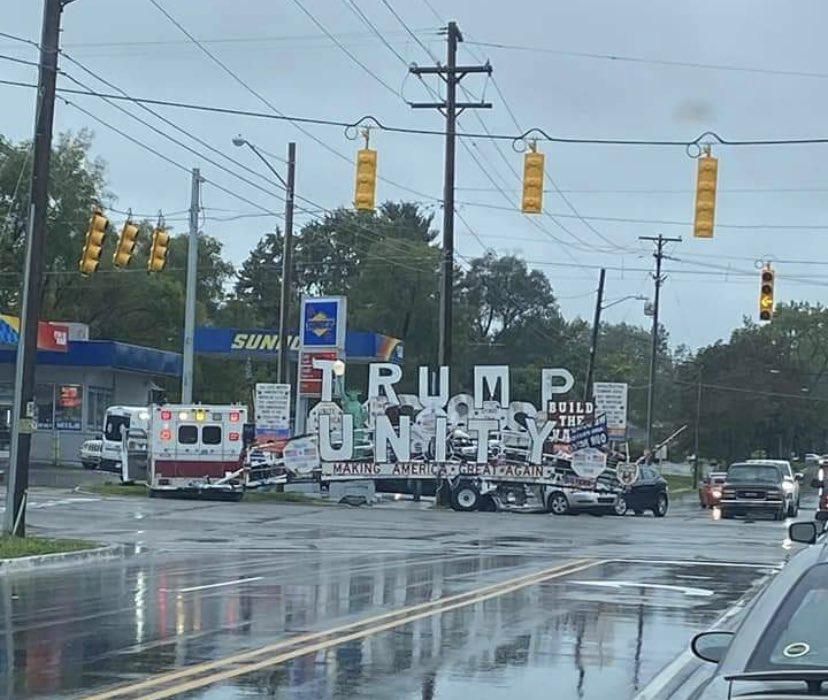 An ambulance that was towing a massive pro-Trump "Unity Bridge" was involved in a three-car pileup in Michigan that resulted in it crashing head-first into a telephone pole.