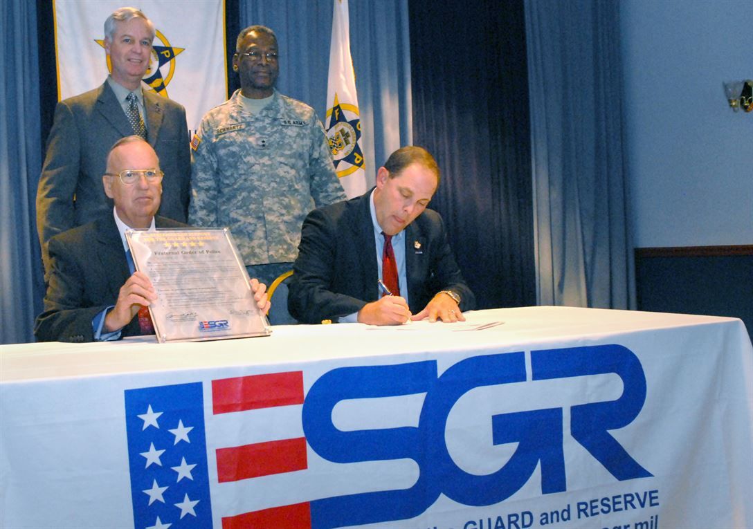 Chuck Canterbury, front right, president of the National Fraternal Order of Police, signs his commitment of support to police officers who serve in the military during a ceremony Oct. 20, 2008, at the Fraternal Order of Police Lodge No. 1 in Washington, D.C. Canterbury is joined by Thomas F. Hall, front left, assistant defense secretary for reserve affairs, Gordon Sumner, back left, executive director for Employer Support of the Guard and Reserve, and Army Maj. Gen. Errol Schwartz, commander of the District of Columbia Army National Guard. DoD photo by Army Staff Sgt. Michael J. Carden