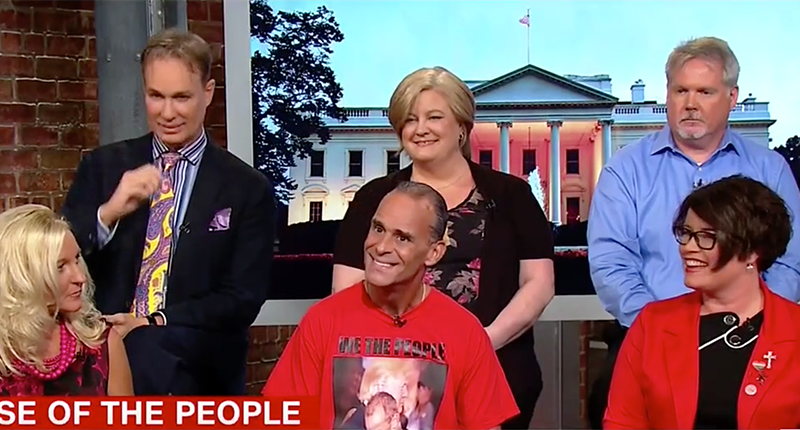 Another supporter arrived for the panel with a T-shirt featuring his photo of what he called a "man hug." He heralded Trump's promises that are coming to fruition such as pulling out of the Paris Climate Agreement and repealing and replacing Obamacare.