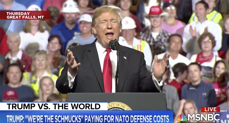 President Donald Trump tells his supporters 'we're the schmucks' for NATO at a campaign rally in Great Falls, Montana.