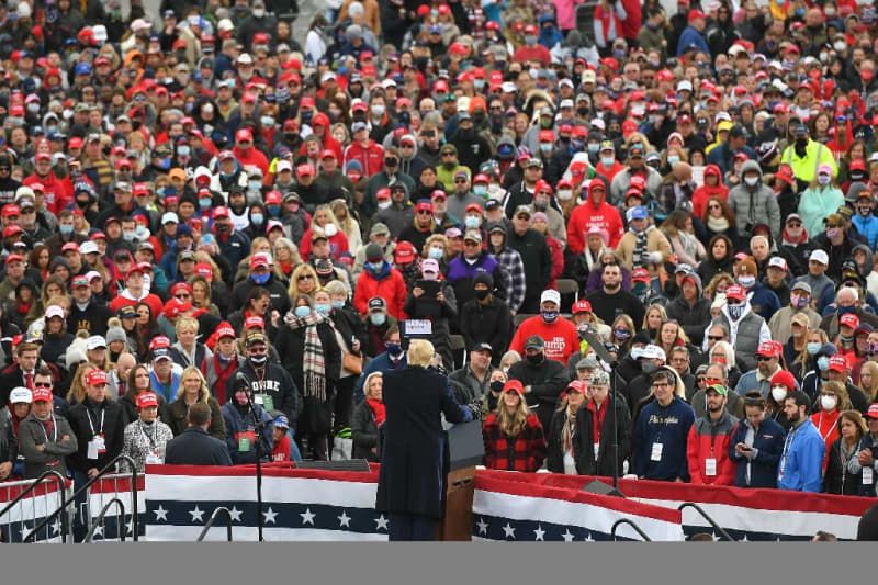 Trump was soon back on Air Force One, flying from Newtown across Pennsylvania to Reading, where a bigger crowd of thousands crammed together, ignoring Covid-19 precautions, on the airport tarmac.