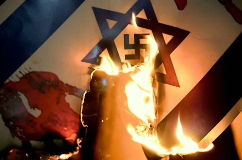 An Israeli flag with a swastika superimposed on the Star of David is burned at a pro-Palestinian protest in Istanbul (Ozan KOSE/AFP)