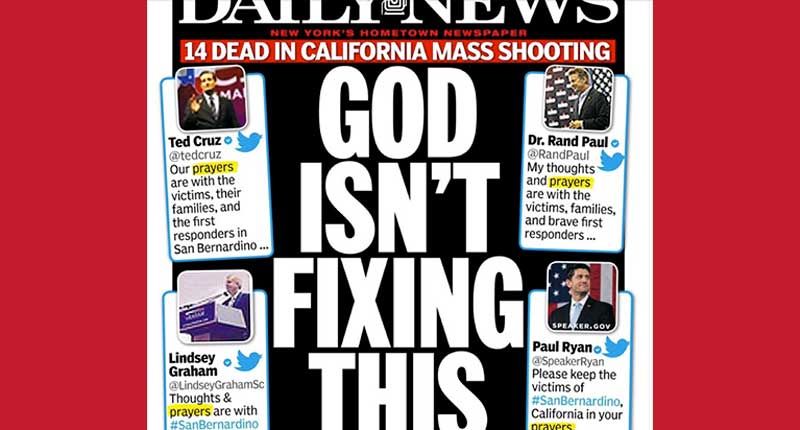 The New York Daily News directly mocked Republican presidential candidates on the cover of its Thursday edition, which reads "GOD ISN'T FIXING THIS" alongside tweets from several contenders: