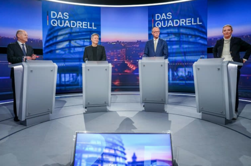 (L-R) Olaf Scholz, Robert Habeck, Friedrich Merz and Alice Weidel take part in a TV debate in Berlin on February 16, 2025 (Kay Nietfeld/AFP)