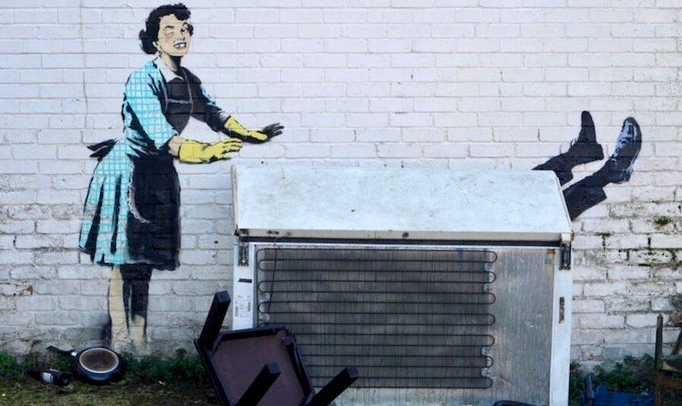 The mural appeared in Margate in southeast England on Tuesday, depicting a 1950s-style housewife with a swollen eye and a missing tooth seemingly shoving her male partner into a real chest freezer.