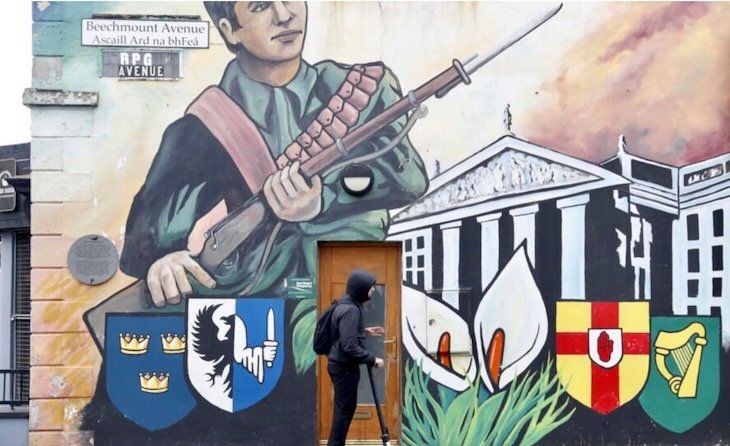 A person rides a scooter past an old Irish republican mural in West Belfast, Northern Ireland on Tuesday, March 28, 2023. © Peter Morrison, AP