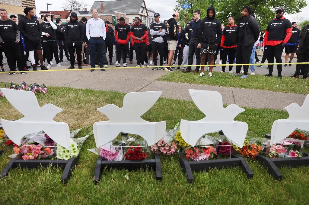 Members of the Buffalo Bills lay flowers at a memorial near where 10 people were killed in May 2022 in Buffalo