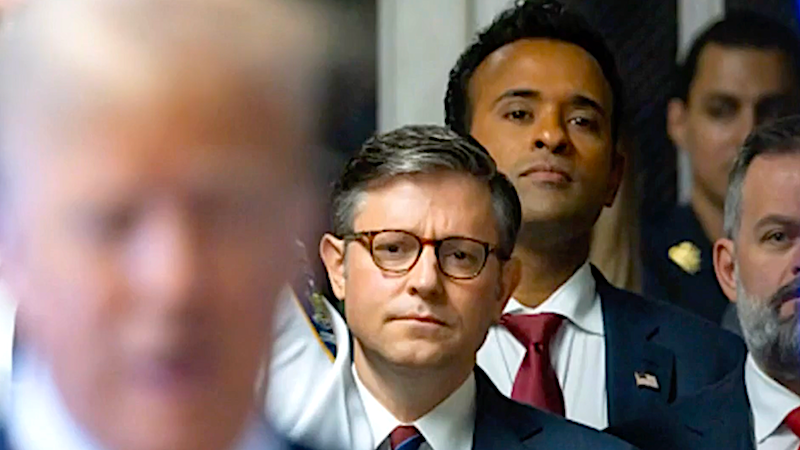 Still, it got weirder. According to Trump's gag order, everything his lackeys did was likely illegal. It forbids him, not just to say what they said, but to direct "others to make public statements" about attorneys, court staff, their family members, the proceedings. Which presumably includes, as several journalists reported, Trump sitting in court editing speeches for his lap-dogs to repeat to the press. The most "gob-smacking" part: The arrival of "shiny-eyed Christian nationalist" and second-in-line to the presidency Mike Johnson with an "all-out assault (on) the federal and state legal systems foundational to the U.S. government." Johnson called the court "corrupt," attacked Judge Merchan's daughter - "Among the atrocities is (her) making millions of dollars fundraising for Democrats" (who's Ginni Thomas?) - said "these are politically motivated trials" and declared Trump "innocent." Jamie Raskin: "I don’t find anything unusual about a fundamentalist theocrat who thinks the Bible is the supreme law of the land attending the legal proceedings of an adjudicated sexual assailant and world-class fraudster for (covering up) payments to conceal (an) adulterous affair. Do you?"