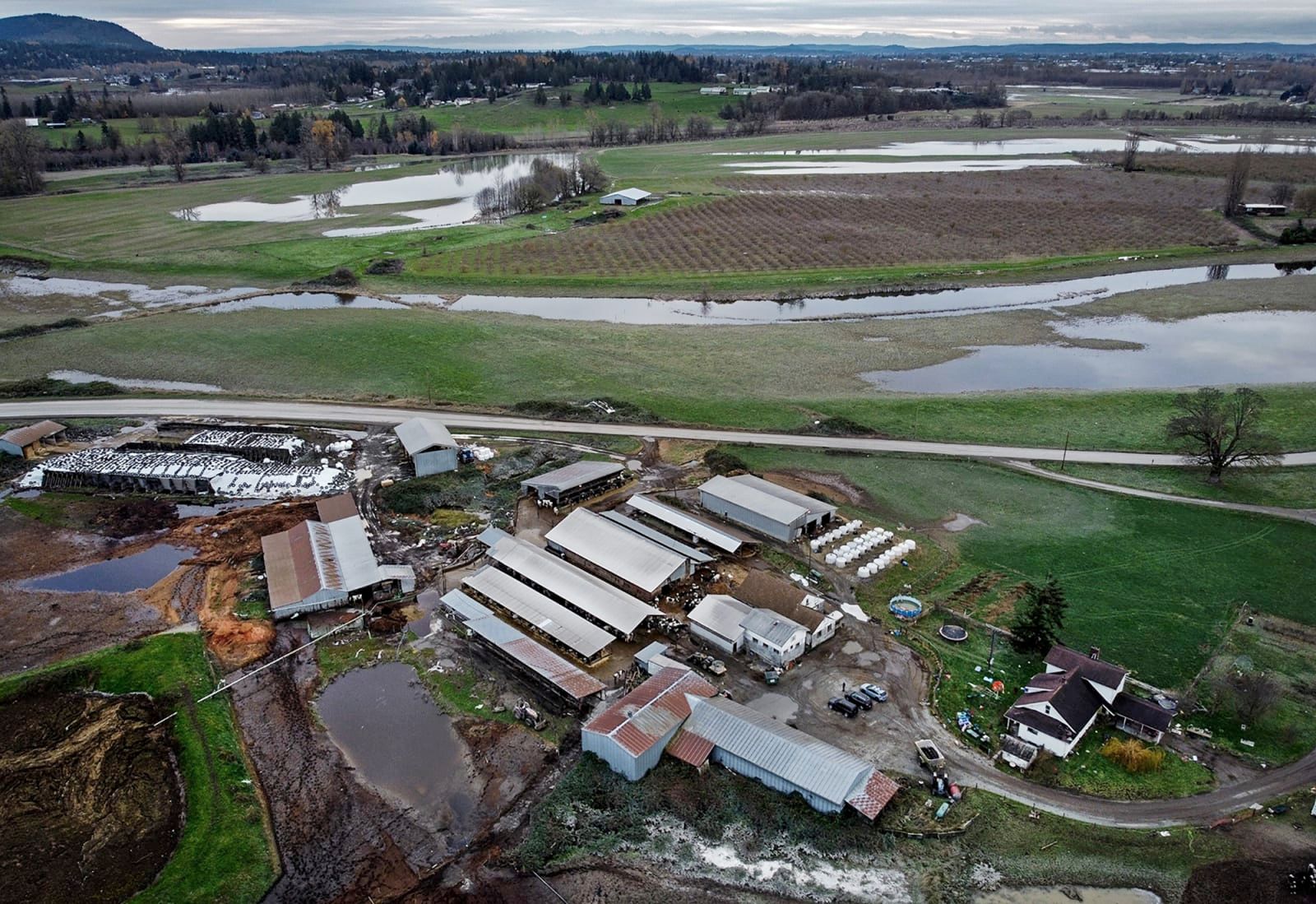 Signs of flood waters remain around Baumgardner Dairy, seen from the air on Nov. 24, 2021, in Mount Vernon, Washington. - Ken Lambert/Seattle Times/TNS