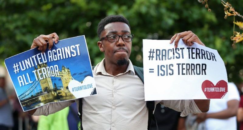 A man stands with anti-racism posters ahead of a vigil, close to the scene of a van attack in Finsbury Park, north London on June 19, 2017 (AFP Photo/Isabel INFANTES)