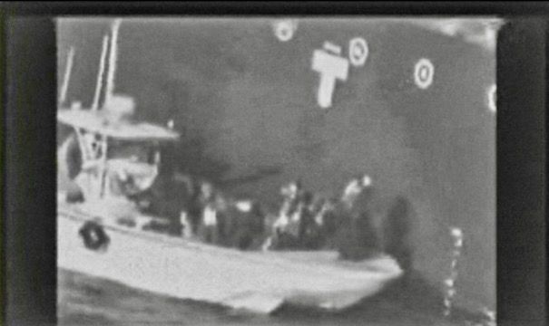As the shot pans away, tracking the reversing patrol boat, a dark patch can be seen further back on the tanker's hull, just above the waterline.
