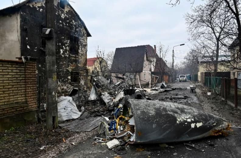 A view shows the wreckage of an unidentified aircraft which crashed into a private house in a residential area in Kyiv on February 25, 2022 (AFP)