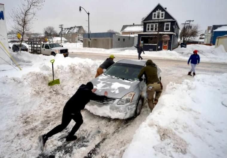 Good Samaritans help to push a car on South Park Avenue in Buffalo, New York (AFP)